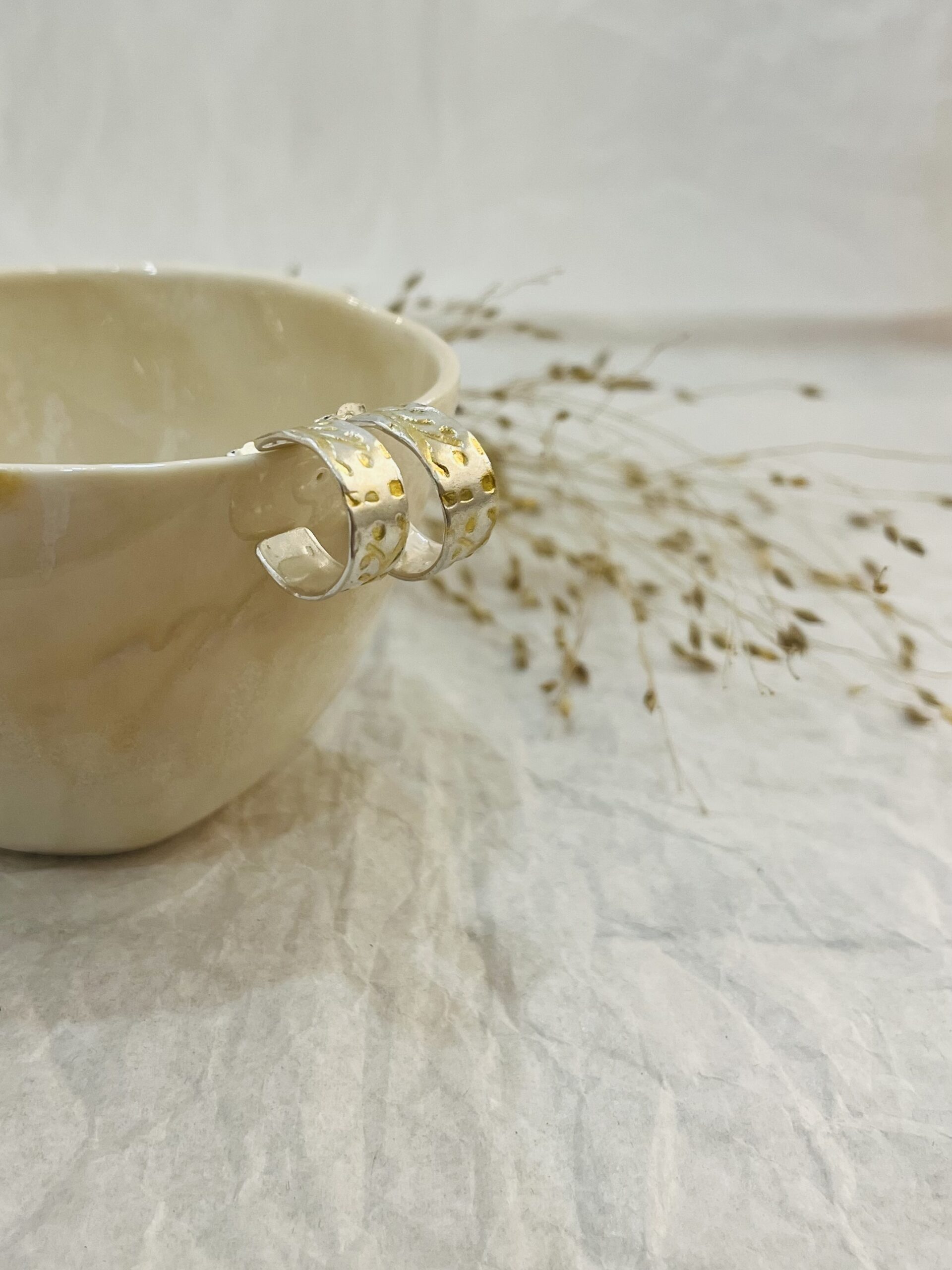 A finom motívumokkal díszített összeállítás darabja között található gyűrű, fülbevaló és nyakék. A darabok csendes eleganciával emelik ki viselőjét a tömegből, ahogyan az arany szín emelkedik ki az ezüstből.
