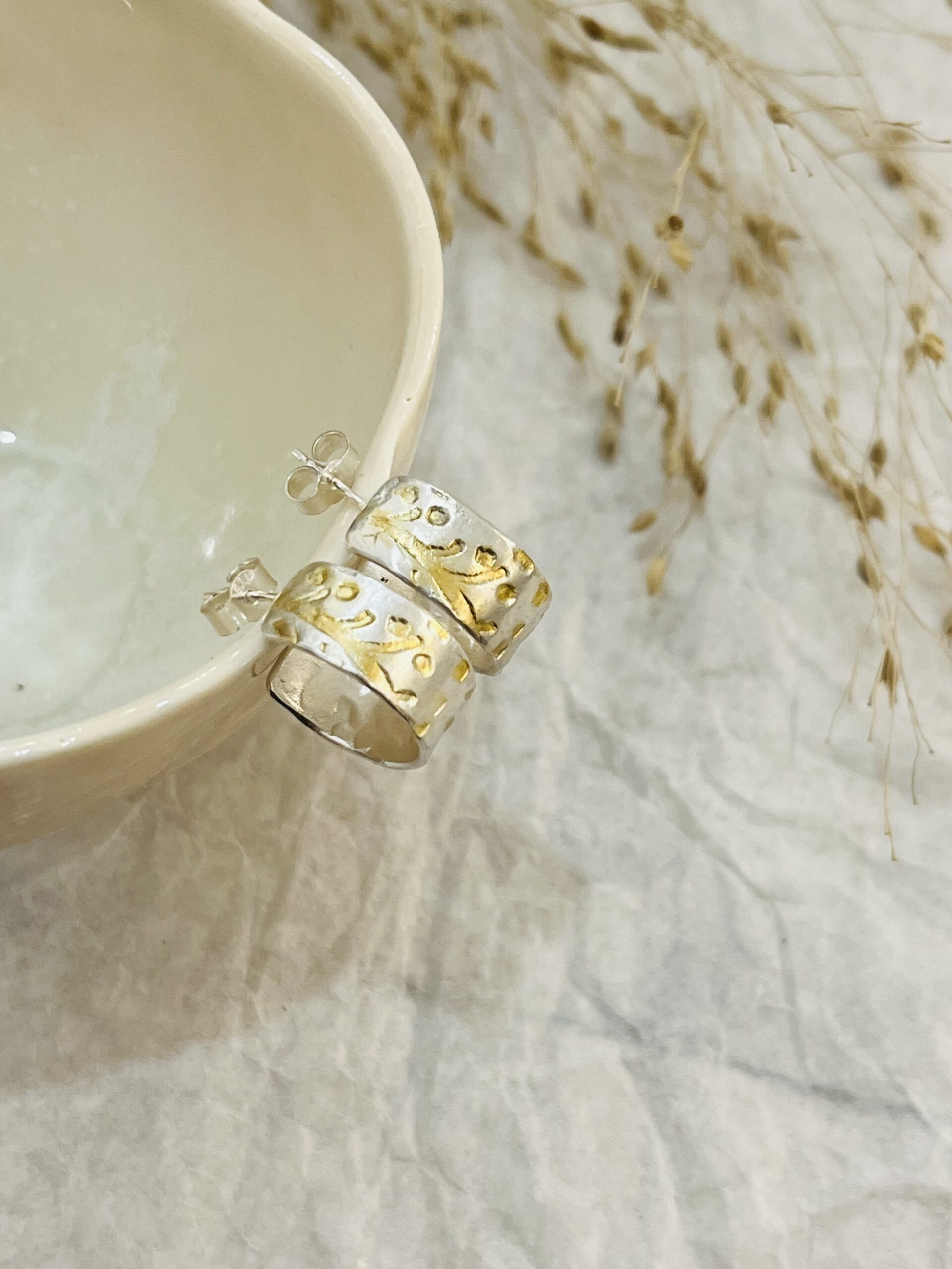 925-ös finomságú ezüstből készült bedugós fülbevaló kékfestő mintával, 14 karátos aranyozással.