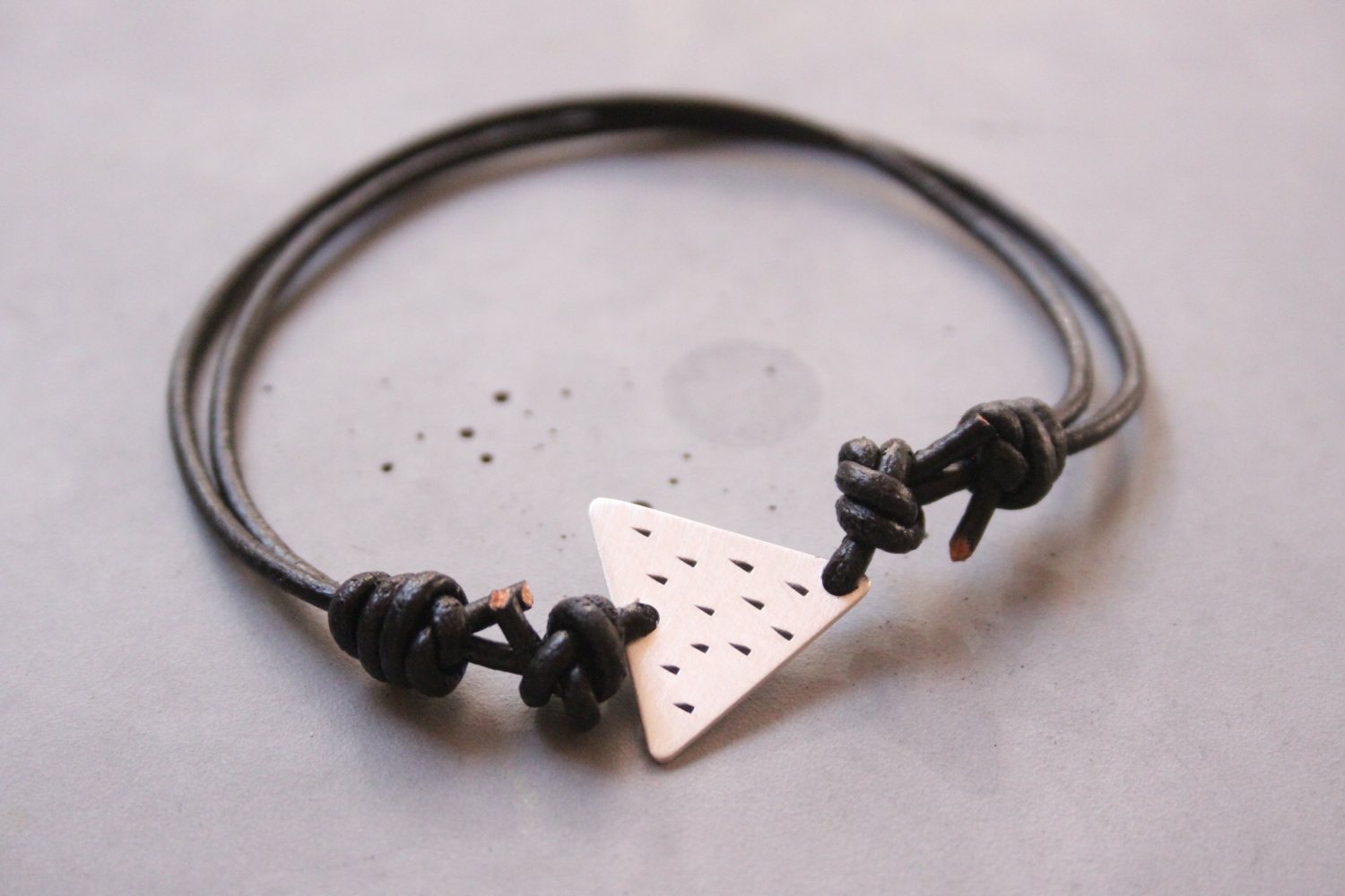 Ezüst ékszer férfiaknak: háromszög karkötő fekete eső mintával és bőrrel kombinálva. A karkötő rész állítható.