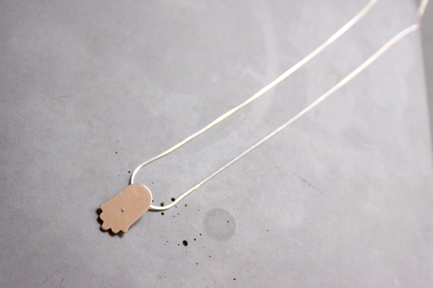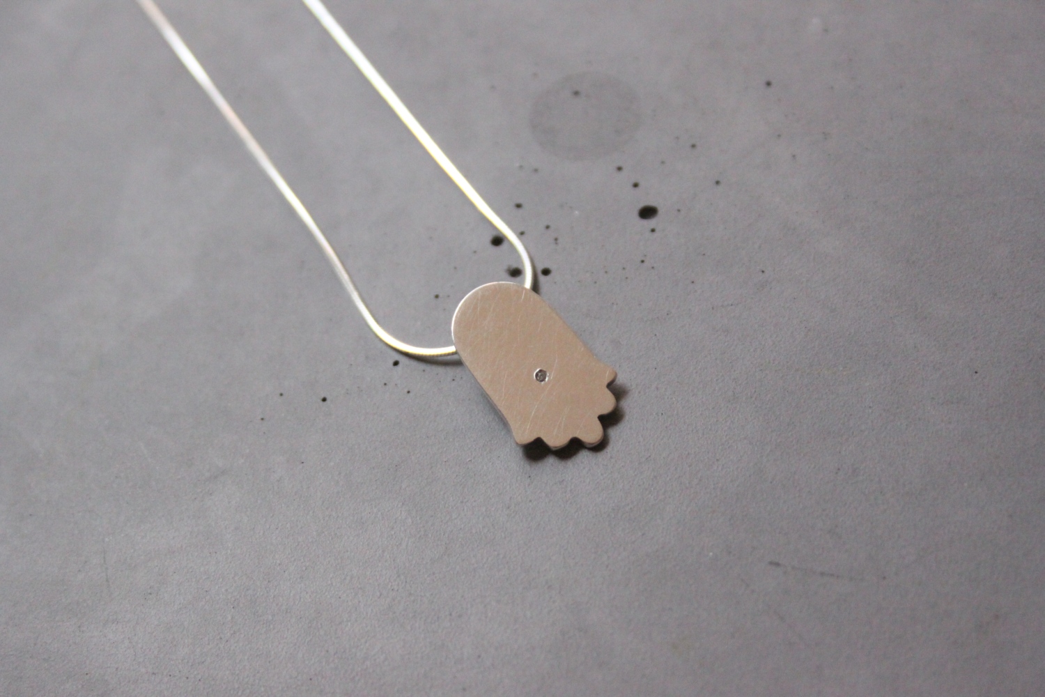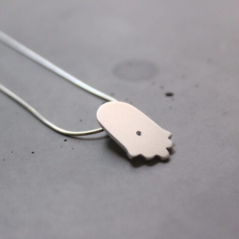 925-ös finomságú ezüstből medál láncon, Fatima keze / Hamsa formában. A kéz közepén apró fehér cirkónium van.