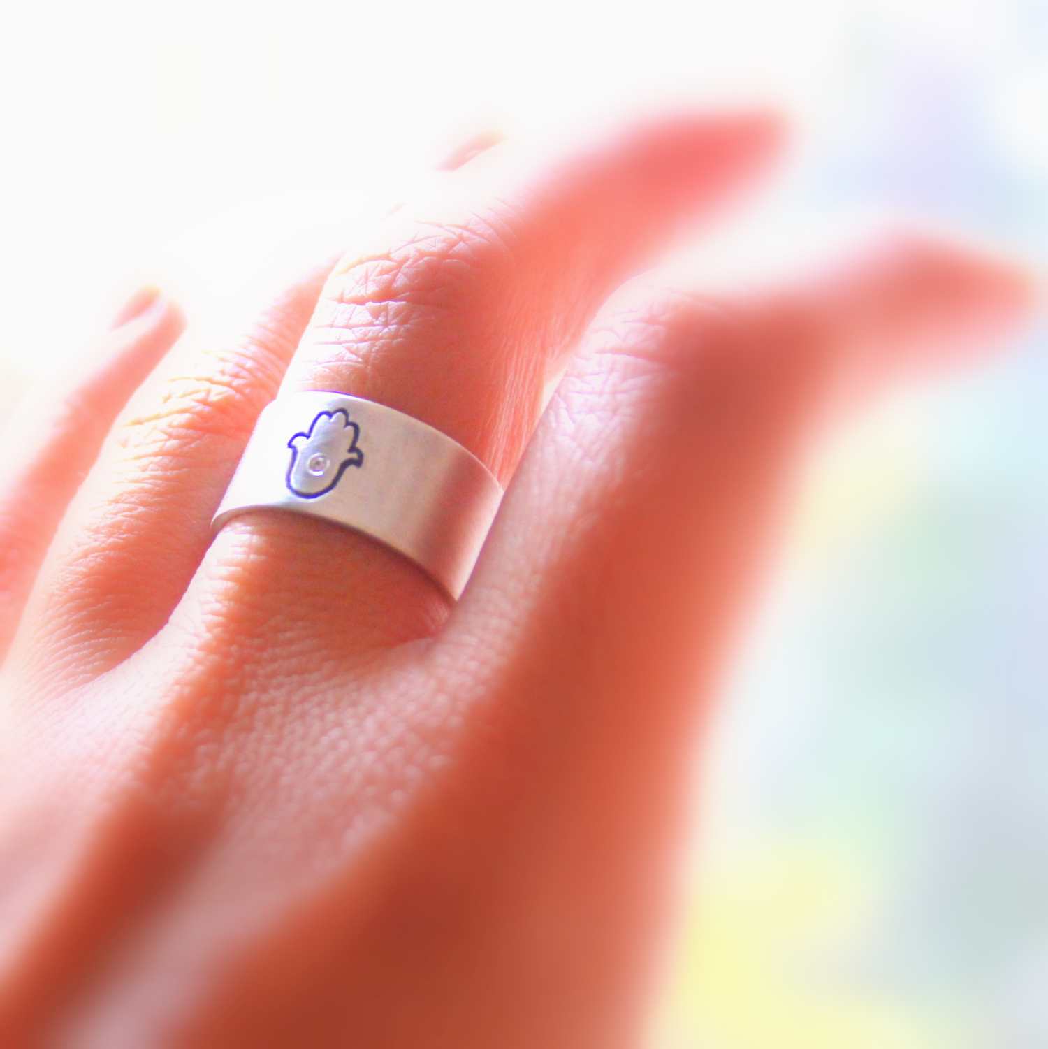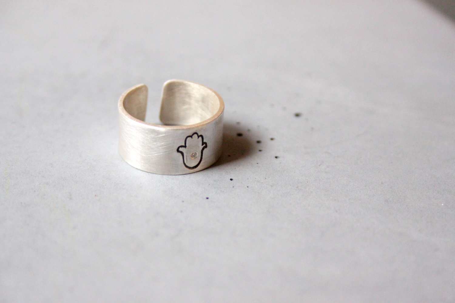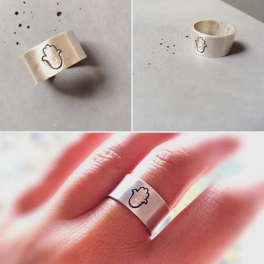 Hamsa / Fatima keze mintás gyűrű apró fehér cirkónium kővel, 925-ös finomságú ezüstből, vésett mintával.