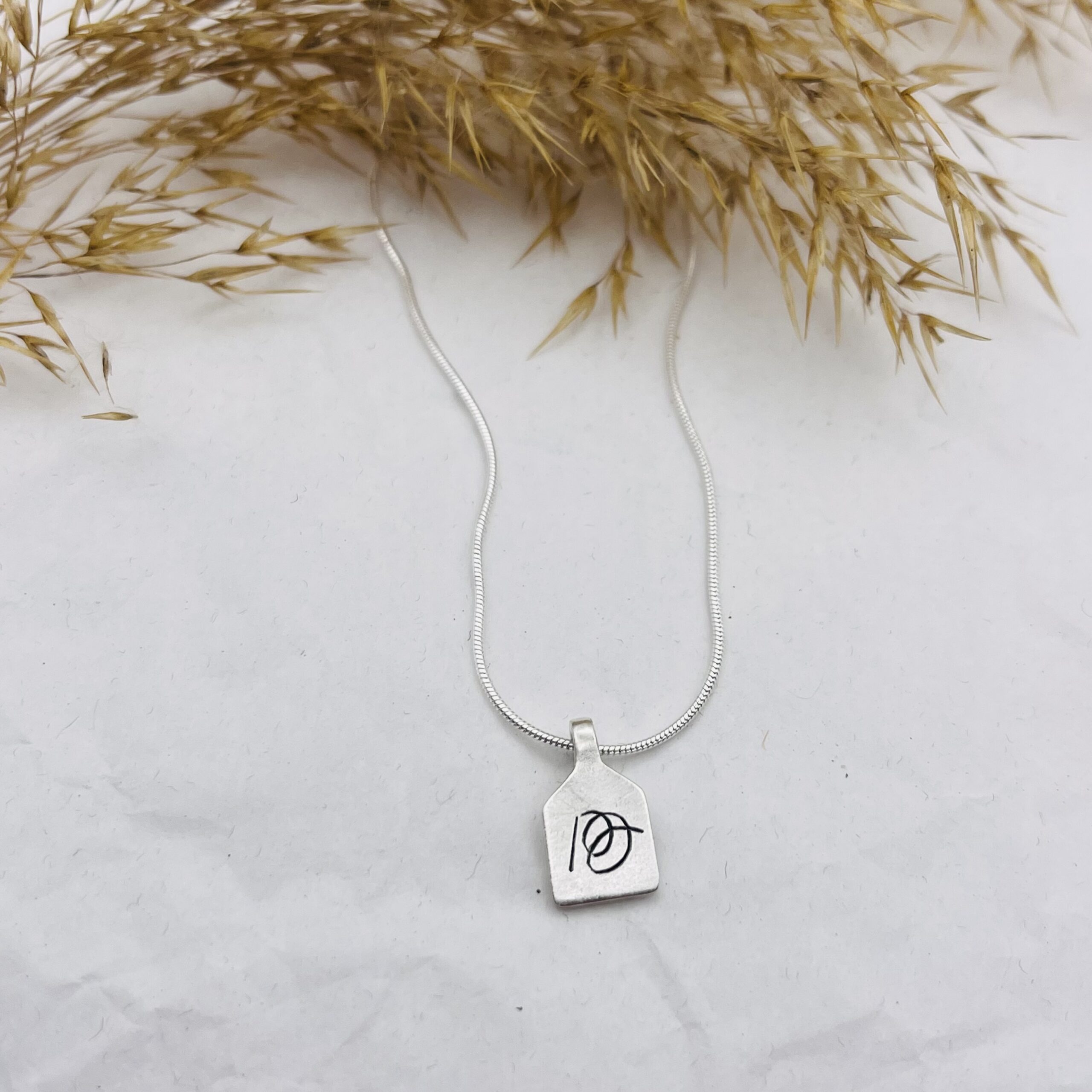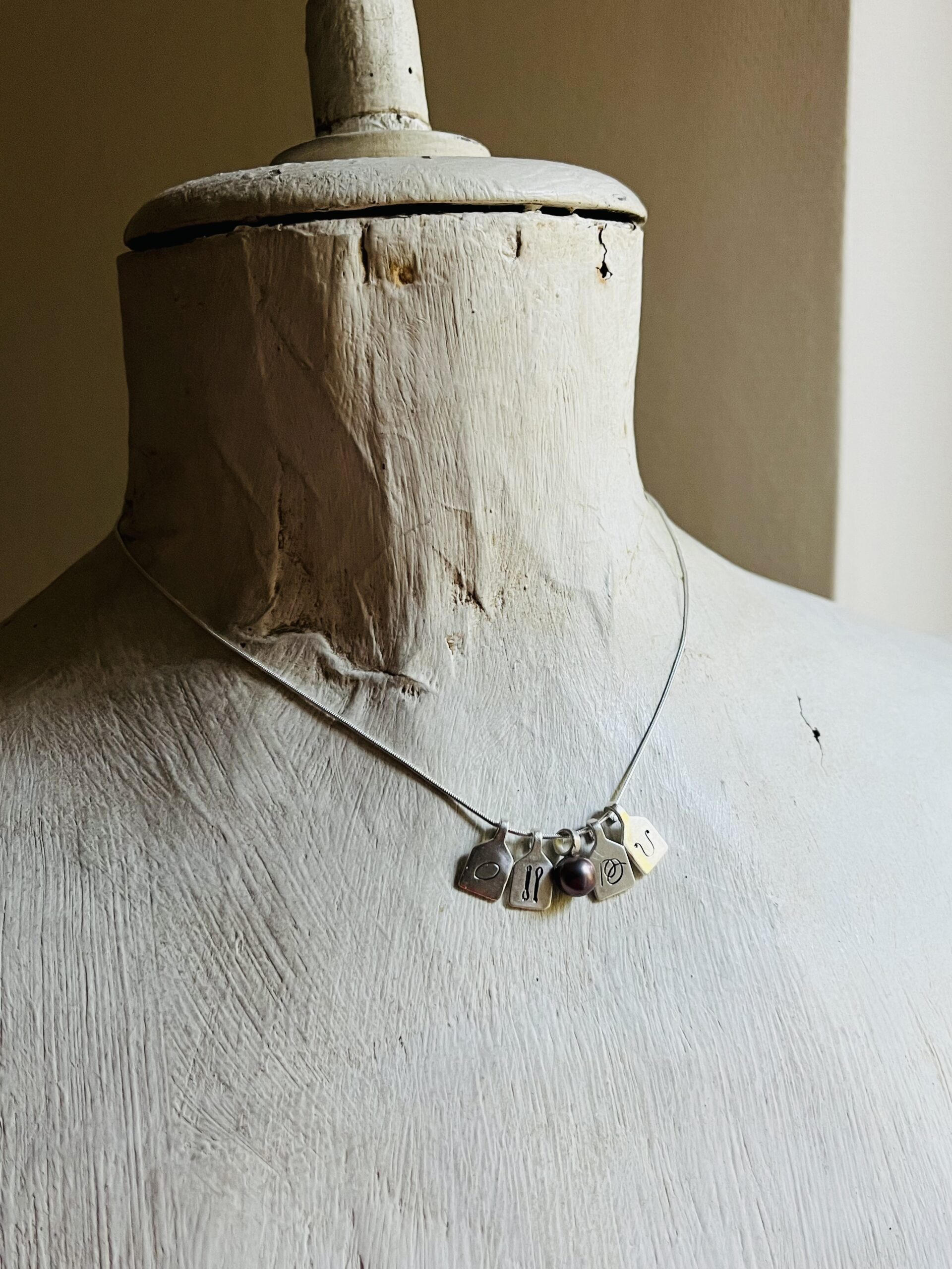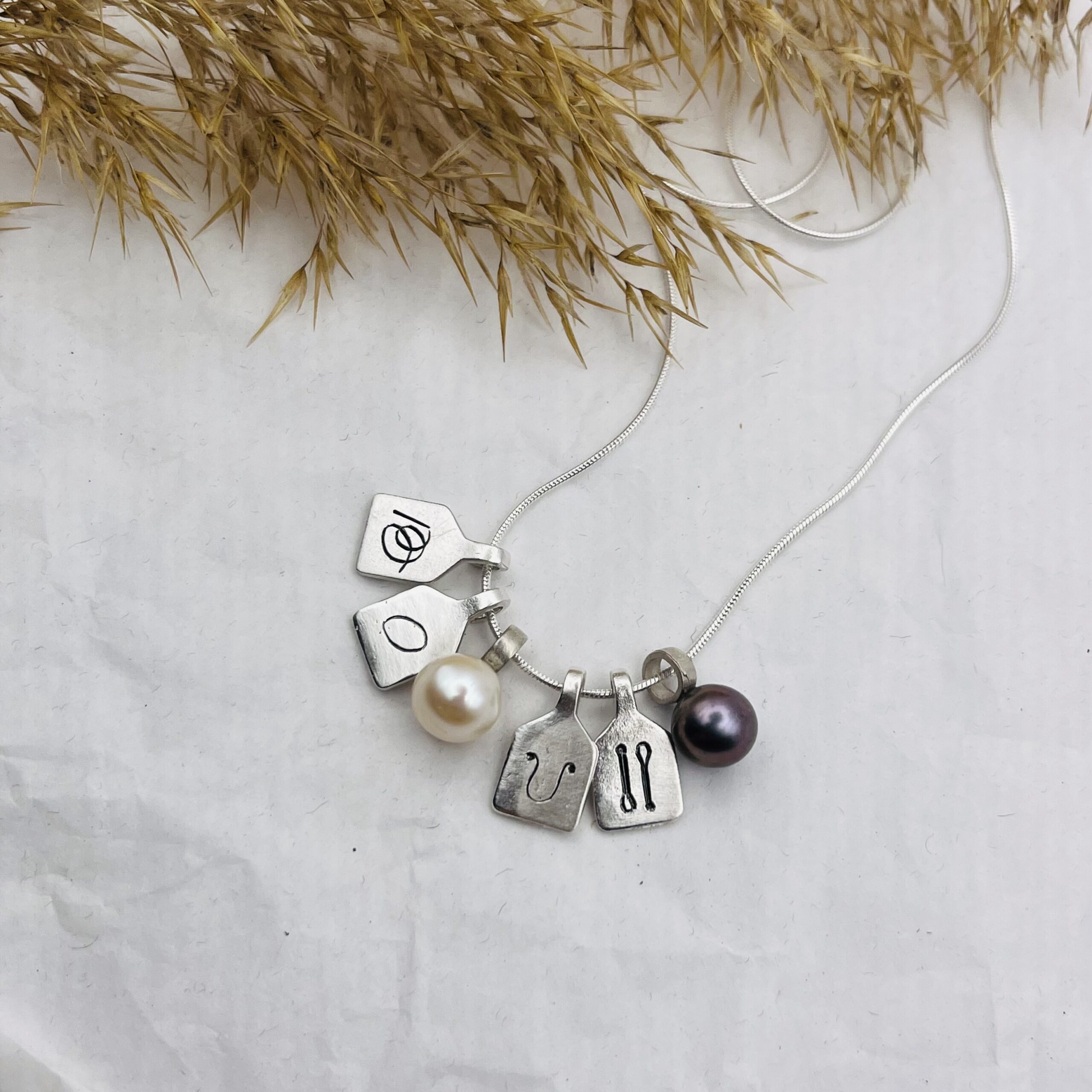 A szabadon összeállítható nyaklánc 925-ös ezüstből készült apró, pontozótábla formájú medálokból, valamint édesvízi gyöngyökből áll. Az egyes kézi szerek rajzai fekete színnel vannak kiemelve.