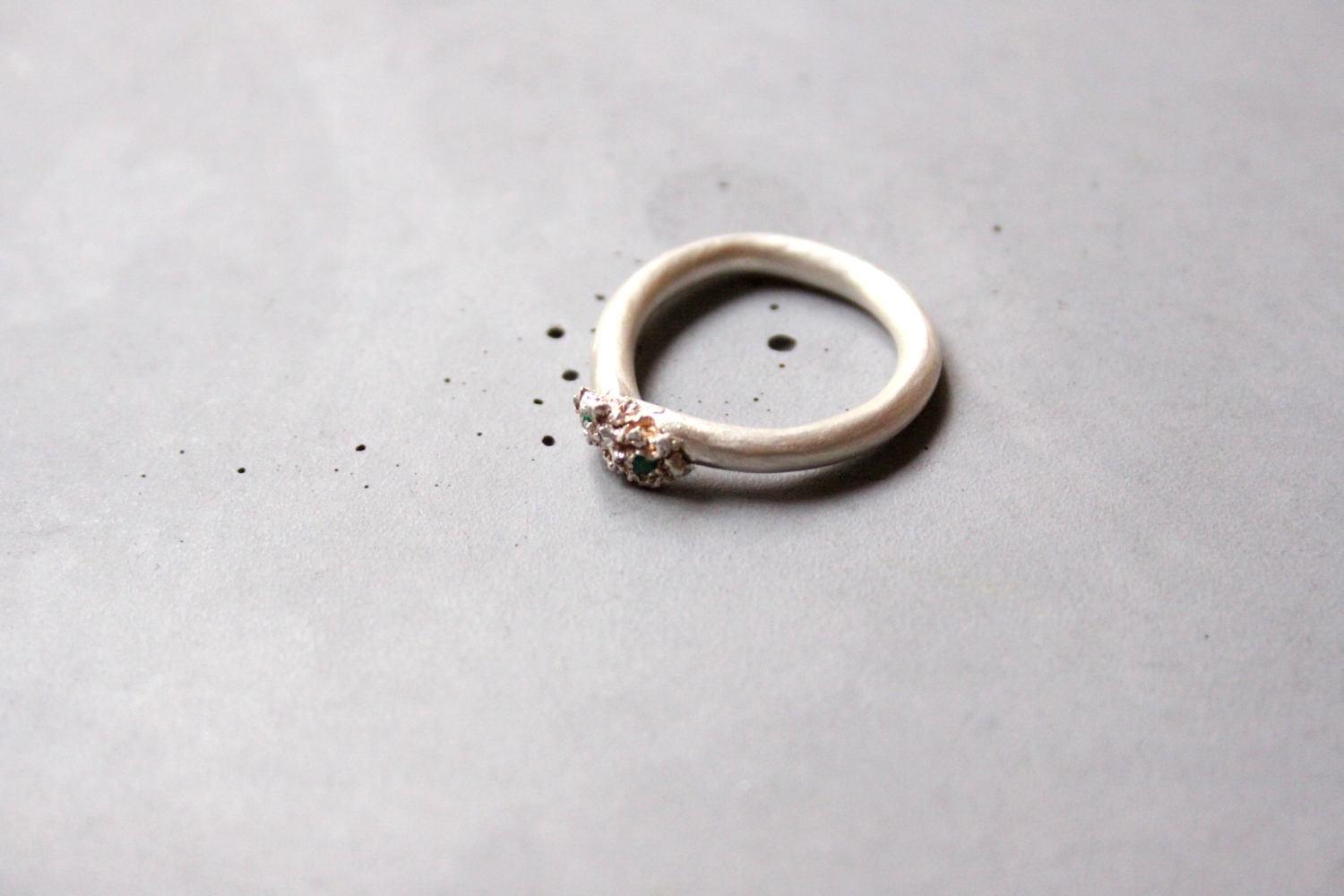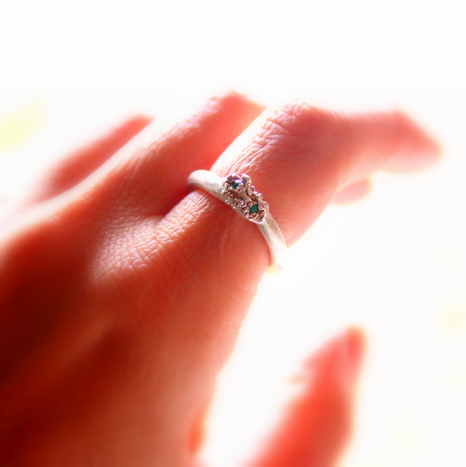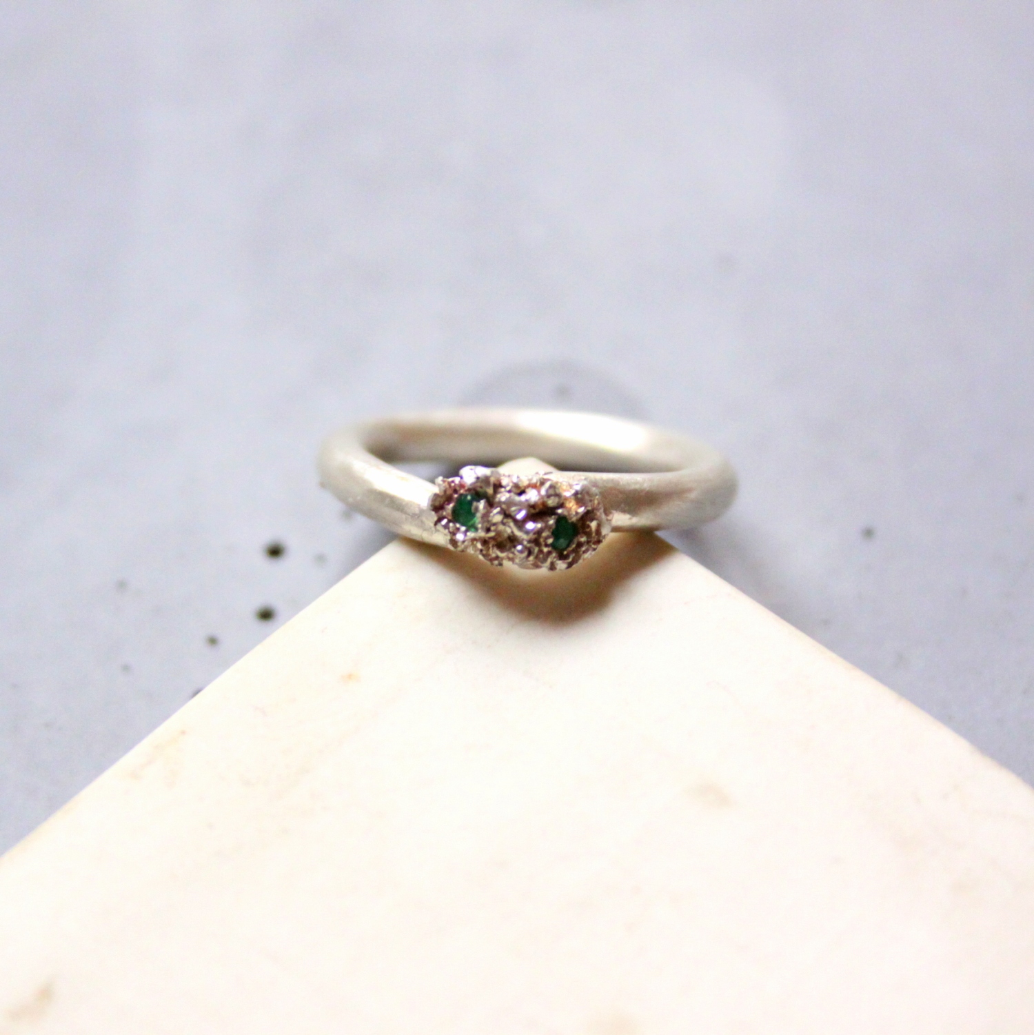 Úgynevezett statement, azaz feltűnő gyűrű: viaszból formált 925-ös finomságú ezüstből készült gyűrű, rusztikus végződéssel, két darab apró zöld tsavorit drágakővel.