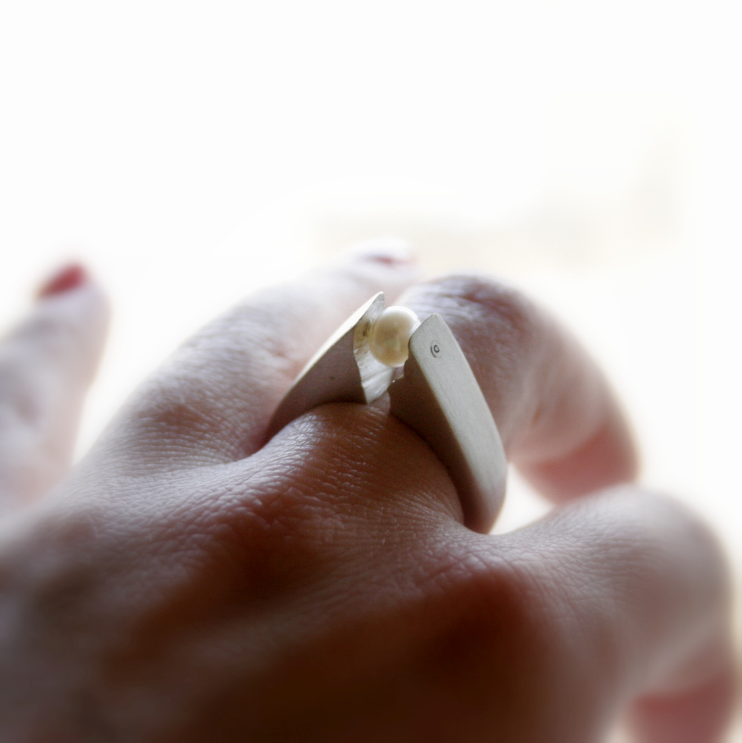 Úgynevezett statement, azaz feltűnő gyűrű: 925-ös finomságú ezüstből készült gyűrű, középen „szakadékkal”, amit egy fehér tenyésztett gyöngy „hidal át”. A gyűrű súlya mérettől függően 7-10 gramm.