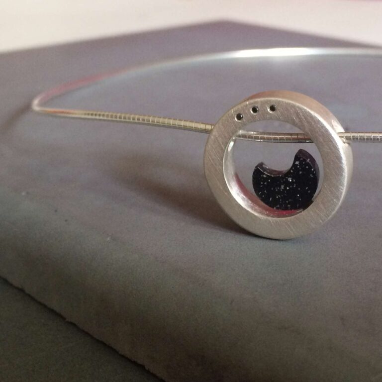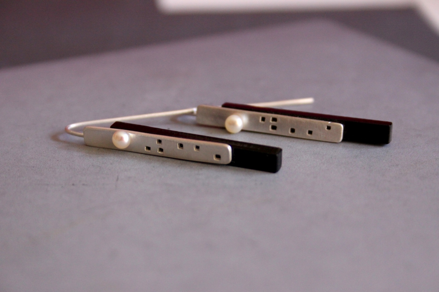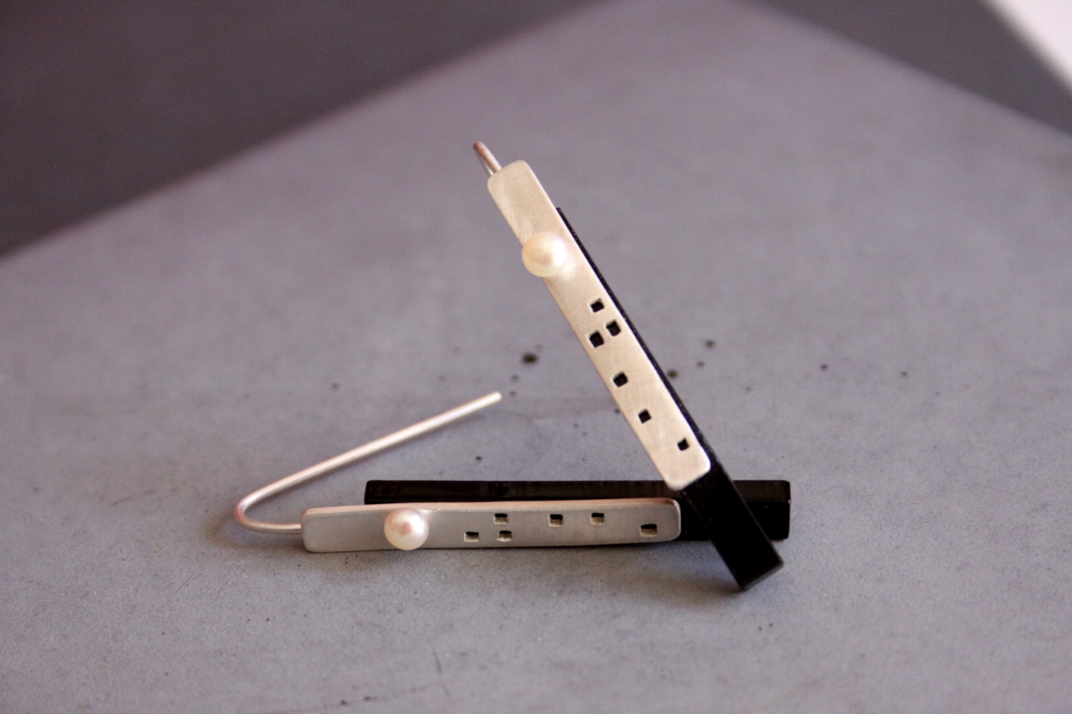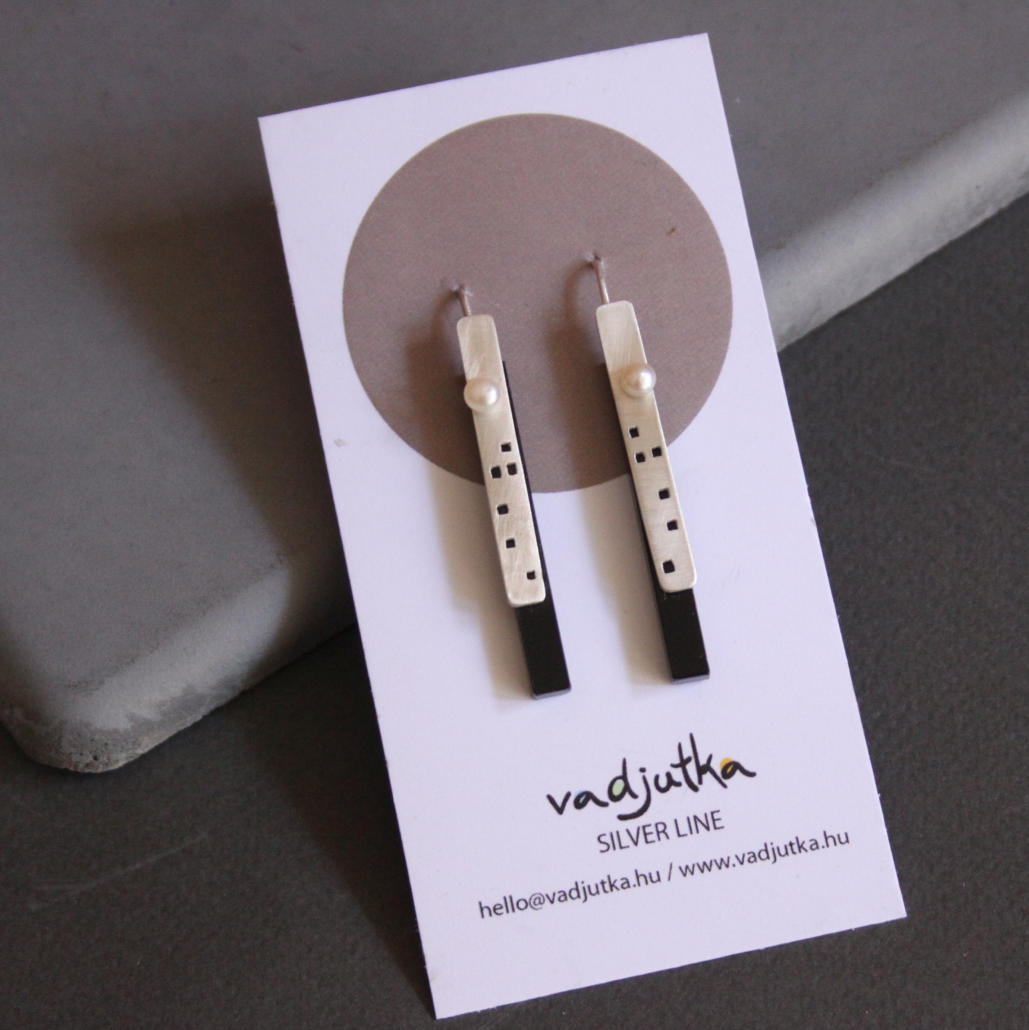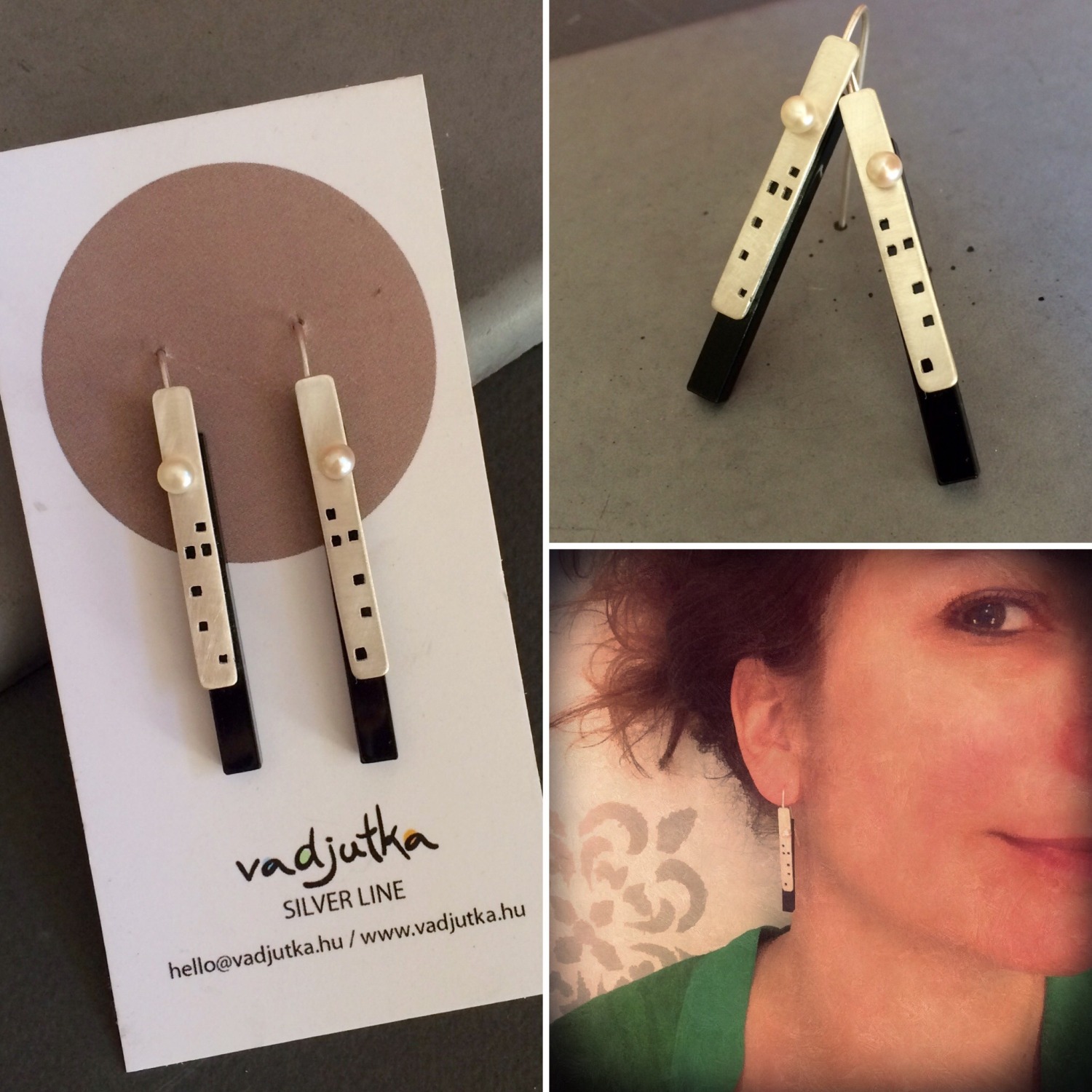 A város feletti telihold – távoli és misztikus, a felhőkarcolókkal együtt pedig kissé utópisztikus; ez adta az ihletet ehhez az ezüst fülbevalóhoz. A fülbevaló ezüst, fekete plexi és édesvizi gyöngy felhasználásával készült.