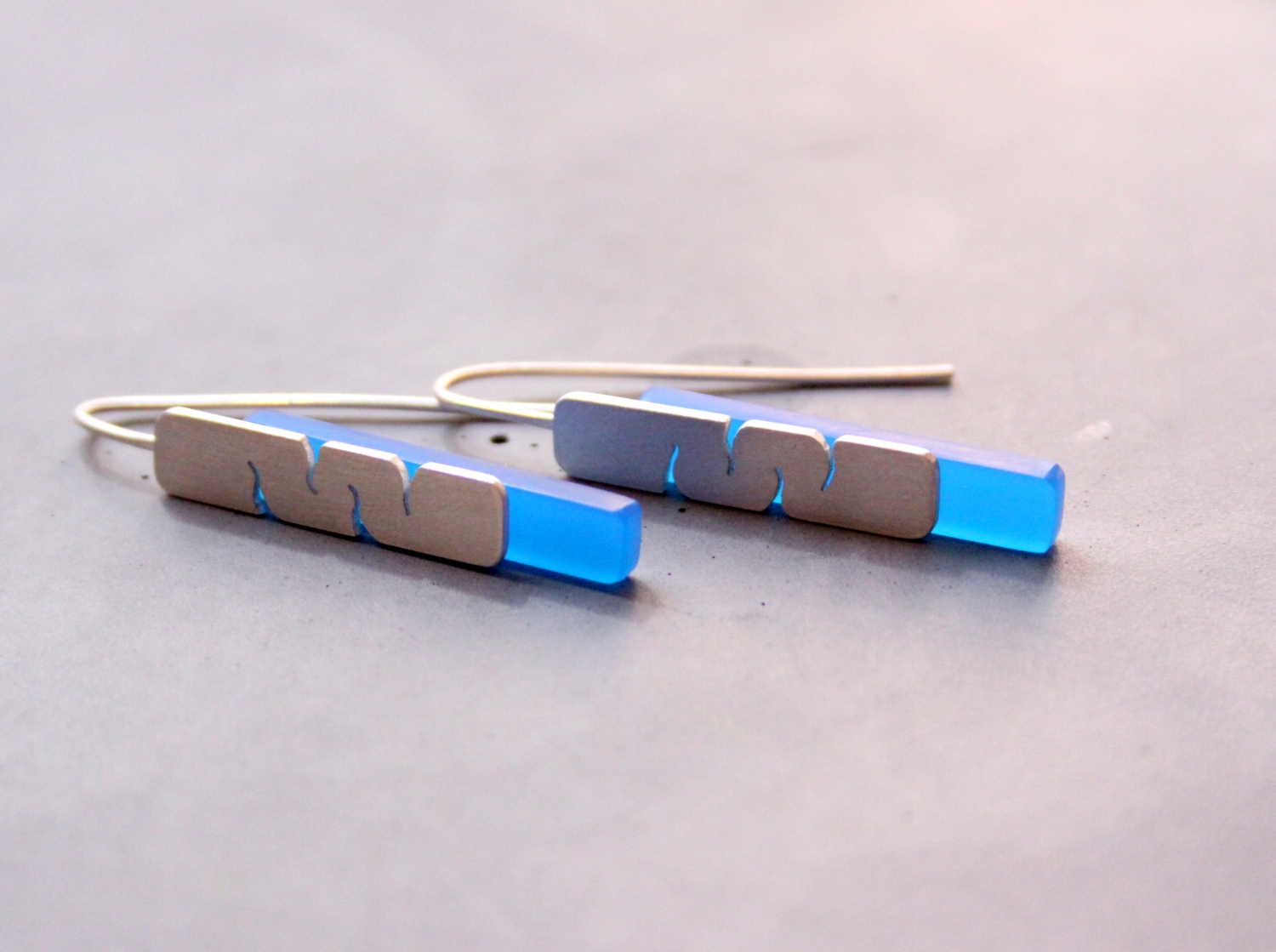 925-ös finomságú ezüstből készült fülbevaló hullámos motívummal, kék plexivel.