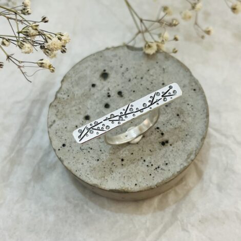 925-ös finomságú ezüst fülbevaló virágzó faág mintával, izgalmas, az ujjunkon átnyúló formában.