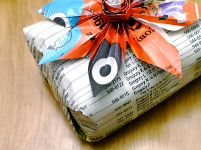 I don’t use Xmas packinging papers for years now; in fact I dont package my birthday gifts into paper as well. We buy packaging paper for lots of money, and after 3 minutes the paper lands in the garbage in most of the cases. I think packinging in paper is a complete waste from financial and eco point of view. That is why I dont use papers for packaging, only bags, so that the giftee can regift it in the future. On the other hand it always feels good to get a nicely wrapped gift, so I collected a few ideas that match the critearia of being nice, eco and financially rational. (Photo above: recycling small pieces of papers: cut circles, sew them together, and you get a nice ribbon!)